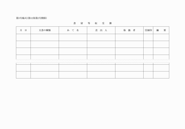 (2) 書留扱い(代金引換の取扱いを除く。以下この号において同じ。)又は民間事業者による信書の送達に関する法律(平成14年法律第99号)第2条第6項に規定する一般信書便事業者若しくは同条第9項に規定する特定信書便事業者の提供する同条第2項に規定する信書便(以下「信書便」という。)の役務のうち書留扱いに準ずるものとして文書主管課長が定めるものによる文書等は、書留等収受簿(別記第3号様式)に記載するとともに担当課に配布し、受領印を徴さなければならない。